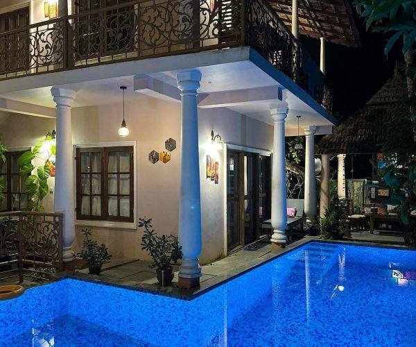 The newly constructed Mandaram Villas feature three spacious and elegantly designed bedrooms, each equipped with expansive open-air bathrooms offering ample hot water and solar-powered electricity. The villas are conveniently located just 200 meters from the stunning Marari Beach. Guests can enjoy an 11-meter L-shaped pool, shared among the three rooms. The dedicated team comprises a local chef, a manager, and a housekeeper, with a caretaker available on-site around the clock.